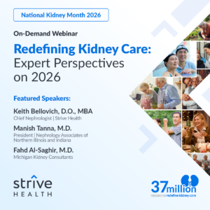 On March 24, 2026, Strive Health hosted “Redefining Kidney Care: Expert Perspectives on 2026,” bringing together Keith Bellovich, D.O., MBA of Strive Health, Fahd Al-Saghir, M.D. of Michigan Kidney Consultants and Manish Tanna, M.D. of Nephrology Associates of Northern Illinois and Indiana to discuss the trends reshaping how we identify, treat and support the 37 million Americans living with kidney disease.